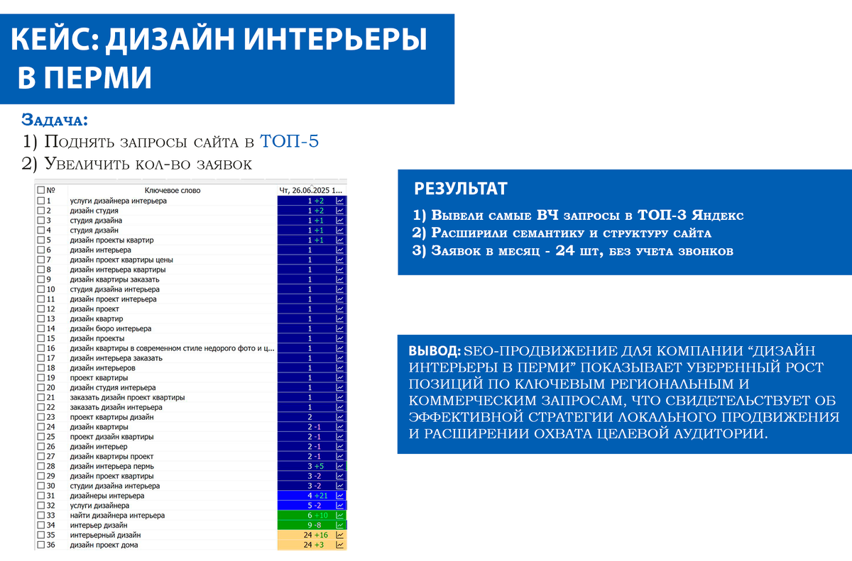 - Вывод студии дизайна интерьеров в ТОП Яндекса - Рост заявок от локальных клиентов - Продвижение по коммерческим запросам в регионе - Стабильный поток обращений из поиска Если вы владелец студии дизайна интерьеров или частный дизайнер и сталкиваетесь с такими проблемами: - Сайт есть, но заявки приходят редко - Клиенты находят конкурентов раньше вас - По ключевым запросам в поиске закрепились крупные студии - Приходится постоянно искать клиентов через рекламу или рекомендации - Органический трафик не превращается в реальные обращения ..то этот кейс будет особенно полезен. Ниже разберу, какие SEO-решения позволили вывести сайт студии дизайна интерьеров в ТОП-3 Яндекса и обеспечить стабильный поток заявок от целевой аудитории региона. Перед проектом стояли две основные цели: - Вывести приоритетные коммерческие запросы сайта в ТОП-5 поисковой выдачи - Увеличить количество заявок именно от локальных клиентов - Ключевая задача заключалась не просто в росте посещаемости, а в привлечении поль