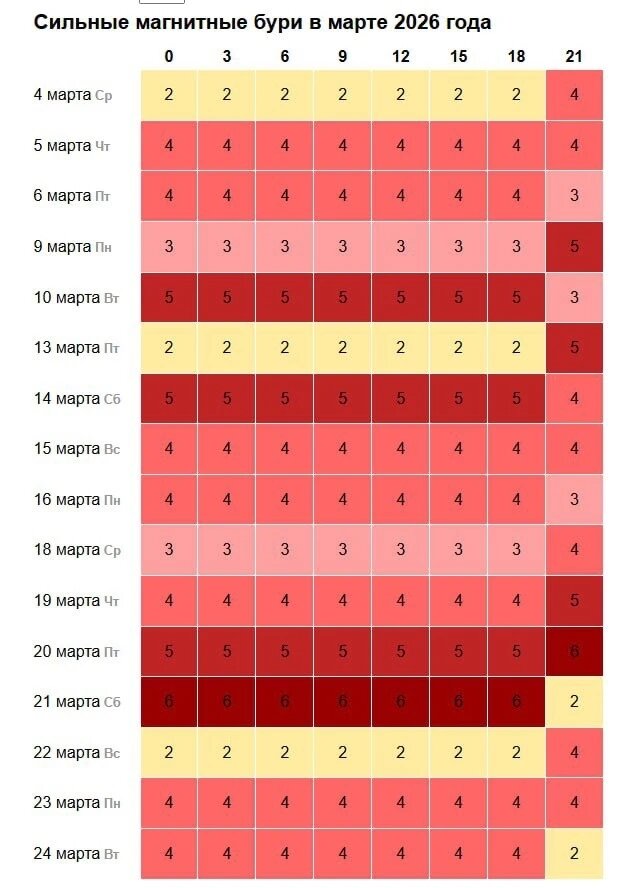 Особенно напряжёнными будут 5, 6, 15, 16, 23 марта – в эти дни прогнозируются бури силой до 4 баллов. Более серьёзные возмущения, до 5 баллов, придутся на 10, 14, 20 и 21 марта. Пик активности ожидается 21 марта, когда магнитосфера будет нестабильной с ночи до вечера, постепенно успокаиваясь лишь к ночи. Врачи советуют метеозависимым следить за самочувствием: больше отдыхать, высыпаться, избегать переутомления, ограничить кофе, алкоголь и тяжёлую пищу. Людям с сердечно-сосудистыми заболеваниями рекомендуется держать необходимые препараты под рукой.