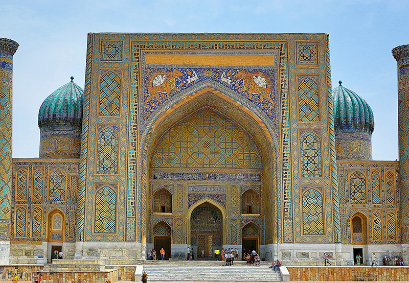 Медресе Шердор, возвышающееся на площади Регистан в Самарканде, является не просто архитектурным шедевром, но и живым свидетельством богатой истории и культурного наследия Узбекистана. Его название, «Шердор», что в переводе с персидского означает «львиное», отсылает к монументальным изображениям мозаики, украшающим главный фасад, добавляя сооружению символическую силу и величественность. Строительство медресе Шердор началось в 1619 году и завершилось в 1636 году, в эпоху правления городом Бахадура Ялангтуша (1578-1656). Это здание стало, пожалуй, самым известным и узнаваемым из трех величественных сооружений, составляющих ансамбль площади Регистан. В отличие от своего соседа, медресе Улугбека, Шердор отличается более пышным декором и монументальностью, что делает его настоящим украшением и символом Самарканда. Главный фасад медресе поражает своим великолепием. Два величественных минарета, устремленные в небо, обрамляют центральный портал, украшенный сложной мозаикой и росписью. Именно