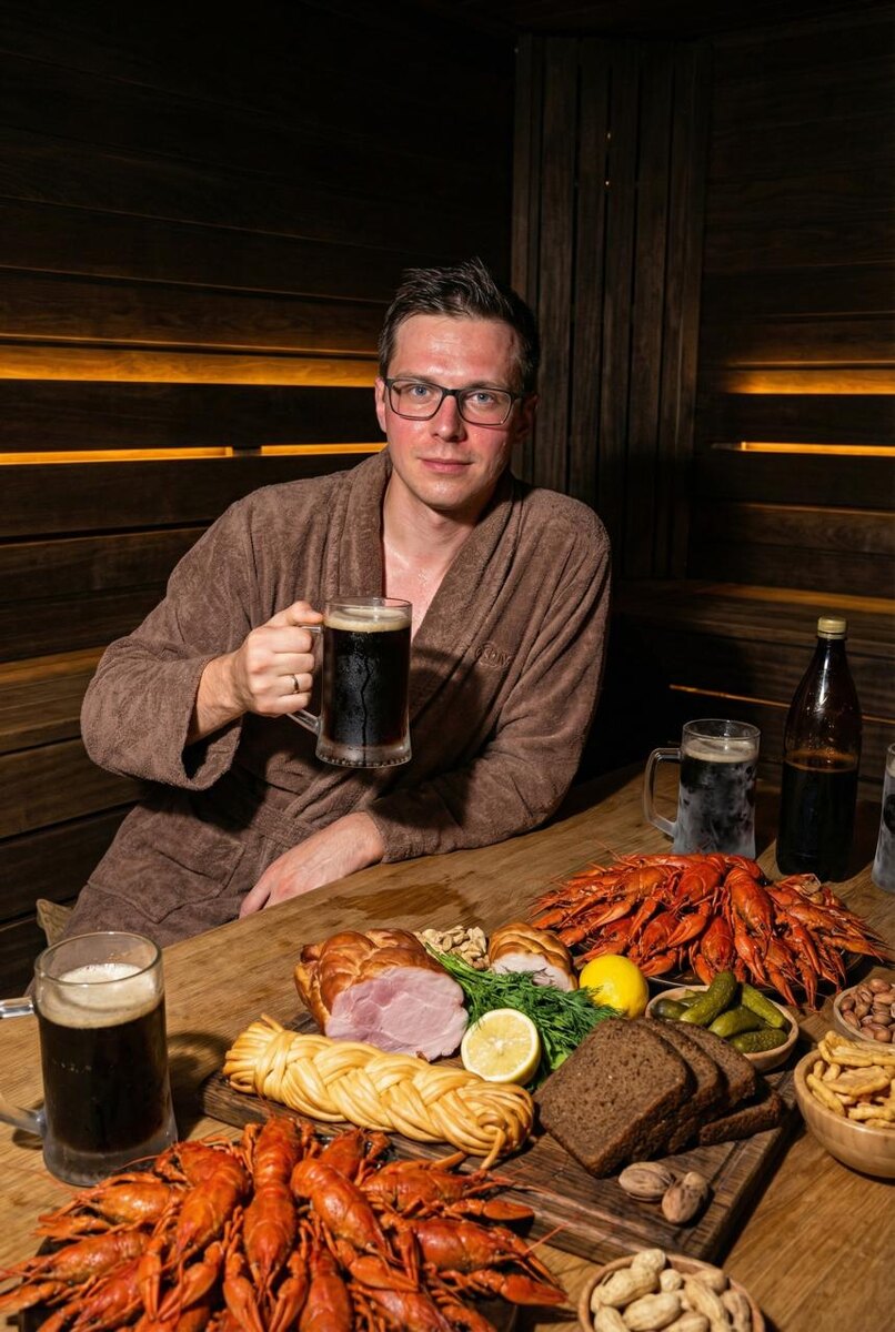 И-обработка фото в стиле "В бане за столом с квасом и раками