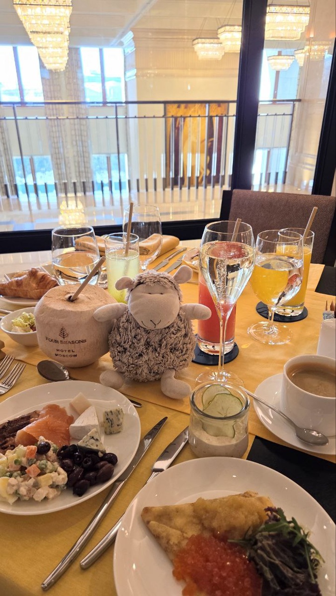 Мы с Овцой Борисом решили провести весь день на релаксе 😏🌴⛱ Утро началось с классного завтрака в ресторане Bystro отеля Four Seasons Hotel Moscow (6400 руб./чел.) Выбор блюд уже классический – оливье, икра, просекко. Плюс приятные добавки в виде сыров, рыб, фруктов и ягод. И конечно, фишка отеля – свежий кокос. Ммм… Люкс!⚡️⚡️⚡️ На горячее - яичные блюда из меню, на этот раз шакшука и глазунья с тортильей. Ну, и десерт – пышные оладушки со смородиновым вареньем, и мега-мега-вкусная лимонная меренга. Обожрака! Далее, Amnis SPA (разовое посещение 12000 руб.) Безлюдный бассейн, мокрая сауна и душ-впечатлений. Ну, а после – жёсткая тренировка в новом (после реновации) спортзале, напичканным крутыми тренажерами. Блинами лакомились целую неделю, пора уже и наказание отработать😈😈😈 Отлично прошёл праздничный понедельник. За окнами толпы людей, шум, гам, а в Four Seasons Hotel Moscow – тишина и комфорт. То, что надо в большом городе ❤️ #fourseasons