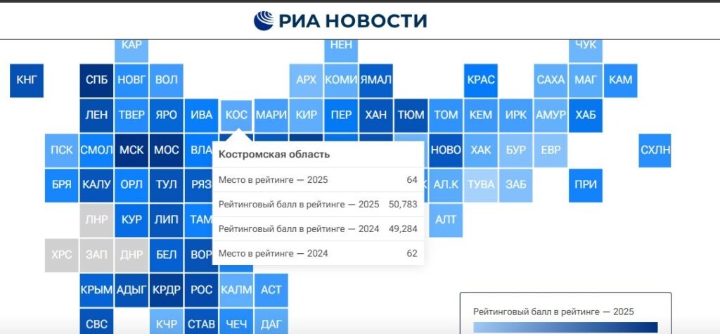 В 2024 году регион находился на две строчки выше, стало известно Logos44.ru. Костромская область по итогам 2025 года заняла 64 место в рейтинге регионов по качеству жизни. Исследование опубликовали РИА Новости. Рейтинговый балл составил 50,783. В 2024 году область занимала 62 строчку. При составлении рейтинга учитывались доходы населения, занятость и рынок труда, жилищные условия, демографическая ситуация, уровень безопасности, экологическая обстановка, уровень экономического развития, транспортная доступность и обеспеченность объектами социальной инфраструктуры, а также другие показатели. Для сравнения соседняя Ярославская область занимает 30 место, в 2024 году показатель был лучше — 29 строчка рейтинга. Ивановская область на 40-м месте. Регион значительно улучшил за год свои позиции. В 2024 году по качеству жизни ивановцы находились на 47 месте.