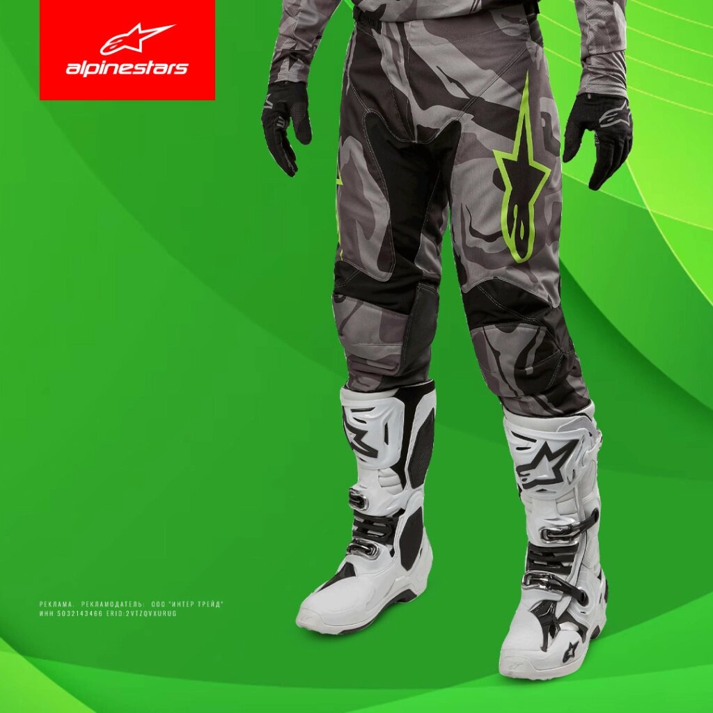 Локальные военные конфликты порождают мировую моду на предметы армейской экипировки. Именно так оттенки хаки и камуфляжа проникают в гражданскую одежду. Казалось бы, кроссменам не нужно быть незаметными, но серия гоночных штанов ALPINESTARS RACER TACTICAL PANT использует камуфляжные цвета: серый, чёрный, бурый, коричневый. А чтобы упавший гонщик не потерялся на фоне грунта, добавлены контрастные вставки из жёлтой, или оранжевой ткани, а также белые логотипы Alpinestars. Тем не менее, основная ткань – защитного цвета. Основа штанов – прочная ткань с полиуретановым покрытием в зонах контакта с рамой мотоцикла и землей при падениях. Есть эластичные продуваемые элементы для вентиляции, тянущиеся эластичные зоны над коленом и на поясе. Карманов – карго, как бывает на тактических штанах, нет. Штаны скроены с учётом сгиба ноги в колене и наклона туловища вперёд. Внутри штанины есть дополнительный объём под шарнирный наколенник. Нескользящие принты в зоне сиденья и на внутренней поверхности но