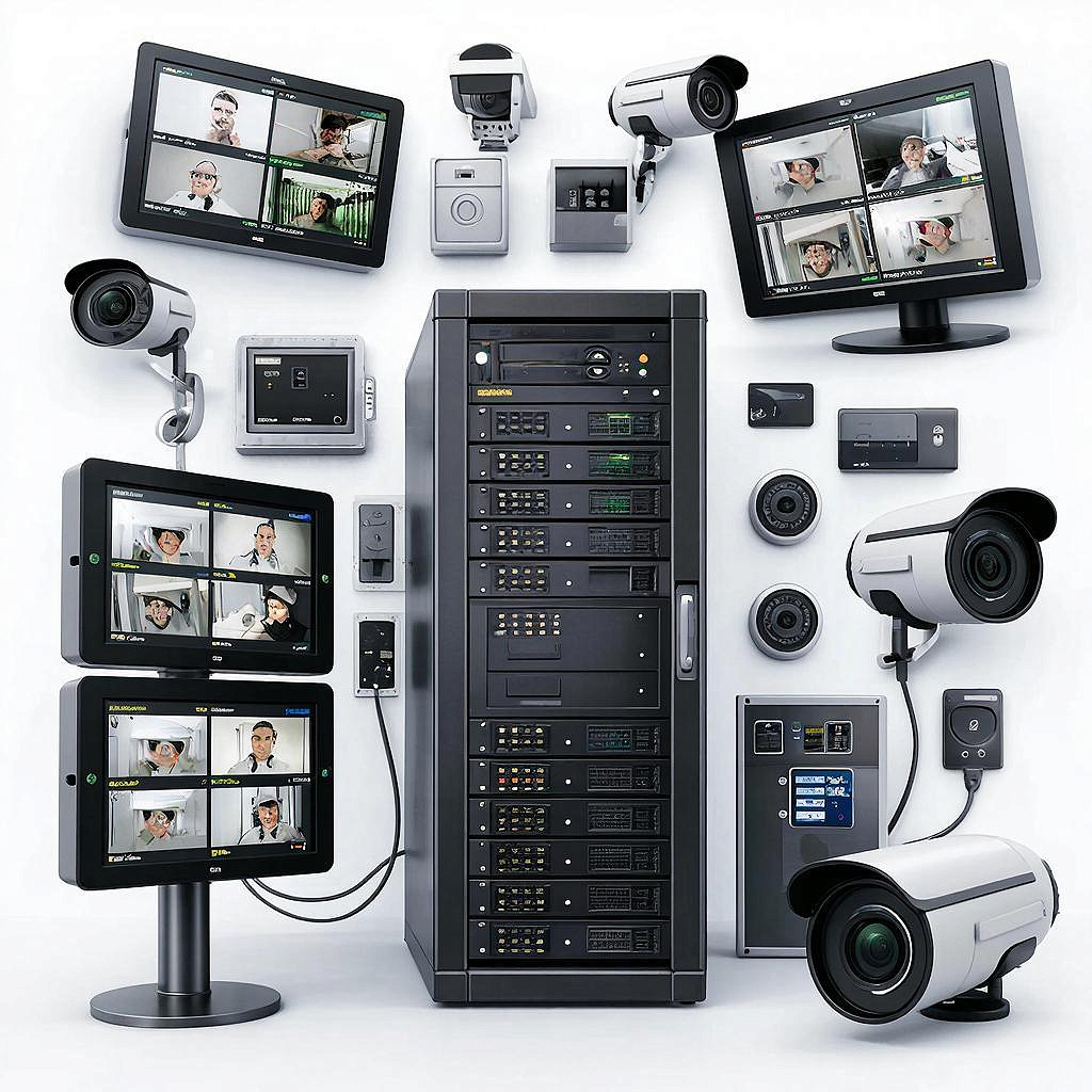 Простейшая конфигурация для магазина или офиса: - IP‑камеры (PoE) → PoE‑коммутатор → NVR/сервер видеозаписи → хранилище (RAID/NAS) → монитор/клиент. - СКУД: контроллеры дверей → считыватели → сервер/облачный сервис → интеграция с видеонаблюдением по событиям.