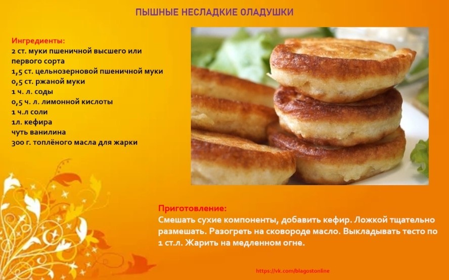 🌀 Ингредиенты: 2 ст. муки пшеничной высшего или первого сорта 1,5 ст. цельнозерновой пшеничной муки 0,5 ст. ржаной муки 1 ч. л. соды 0,5 ч. л. лимонной кислоты 1ч. л.соли 1л. кефира чуть ванилина 300 г. топленого масла для жарки 🌀 Приготовление: Смешать сухие компоненты, добавить кефир. Ложкой тщательно размешать. Разогреть на сковороде масло. Выкладывать тесто по 1 ст.л. Жарить на медленном огне.