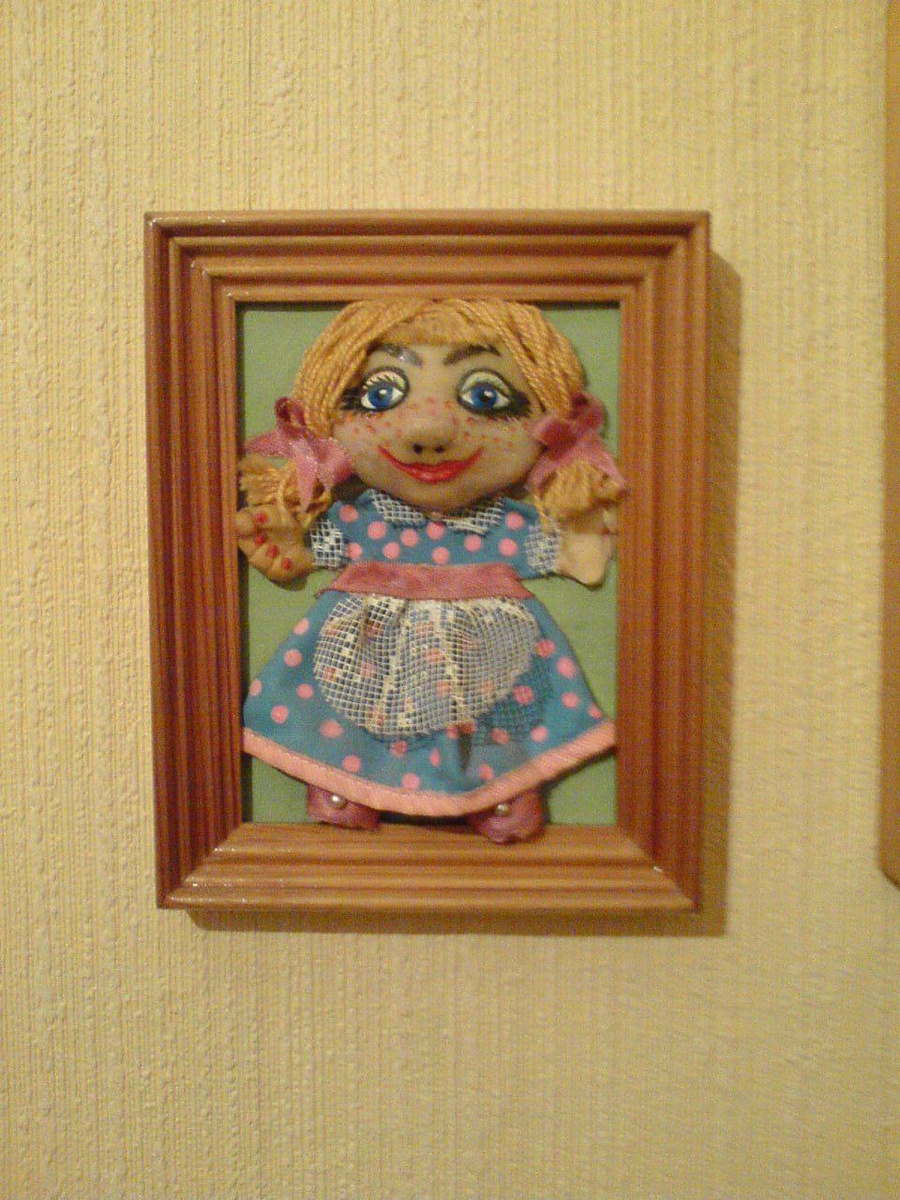 Обычным февральским вечером я оживила историю 40-летней давности. Сидела сегодня с ноутбуком, за окном серо, февраль... И вдруг взгляд упал на полочку. Ту самую, где у меня стоят самые дорогие сердцу безделушки. А среди них — маленькая рамочка, а в ней... девочка с бубликами. Эту фигурку моя дочка Людочка слепила сама, когда ей было года четыре, может, пять. Тогда только-только в магазинах появилась пластика — чудо-материал, из которого можно было создавать такие вот крошечные шедевры. Мы купили её, глаза у обеих горели, и мы пропали. Лепили днями напролёт. Люда слепила девочку. Сама. Раскрасила красками. Кривенько, по-детски, но с такой душой! Я, честно признаюсь, тоже увлеклась — мы тогда много всего налепили вместе. Но эту девочку я почему-то сразу поставила на самое видное место. А потом наступило "потом". Людочка выросла. А фигурка всё стоит. 40 лет я её храню. Для меня это не просто поделка. Это отпечаток её маленьких пальчиков, её первого творческого порыва, нашего общего вр