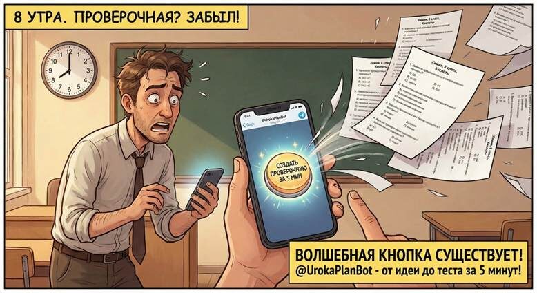 Знакомо чувство, когда в 8 утра понимаешь, что на первом уроке - проверочная, которую ты… забыл составить? Или нужно срочно проверить знания, а тратить час на подготовку и печать нет ни времени, ни сил. Мы все слышали сказки про «волшебную кнопку». Я сам относился к ним скептически. Пока не решился на эксперимент. Цель: от идеи до готовой проверочной работы за 5 минут. Не конспекта, а именно вариантов с заданиями и ответами. Инструмент - бот в Telegram @UrokaPlanBot. Испытание - предмет, где нужна и точность, и понимание: химия, 8 класс, тема «Кислоты». Шаг 1: Старт и выбор «скелета» (0-1 минута) Открываю бота. Первый вопрос - выбор типа заданий для работы. Это ключевой момент. Бот предлагает: • Смешанный • Тест • Открытые • Верно/неверно • Соответствия Для быстрой проверки понимания формул и свойств выбираю «Смешанный». Уже чувствуется разница: не громоздкая КР на весь урок, а точечный срез. Шаг 2: Суть — задаем параметры (1-2 минута) Бот задает уточняющие вопросы. Это похоже на диало