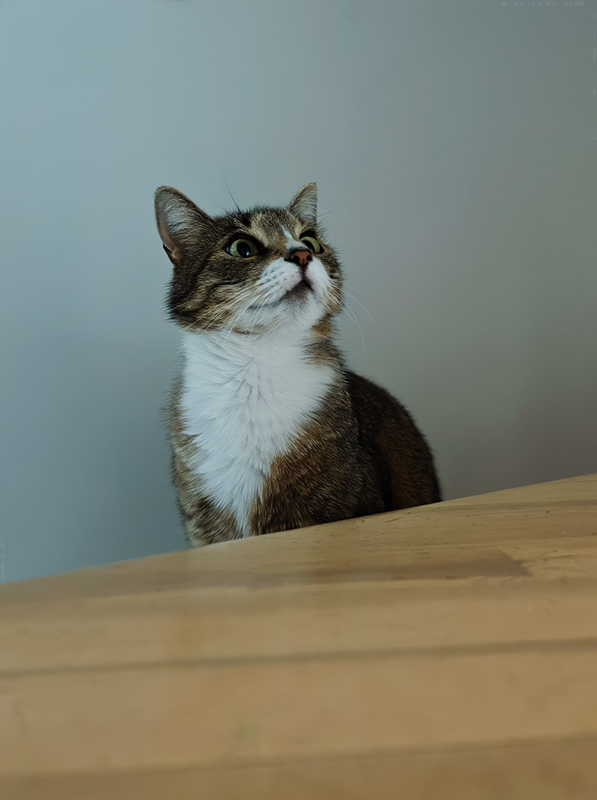 Пришло время представить новым читателям эту таинственную даму, которая крайне редко фигурирует в сводках котоновостей и почти не попадает на фотографии, ибо ведет весьма скрытный и самостоятельный образ жизни. В конце лета 2018 года на многострадальной бабушкиной даче, где мы по сей день разгребаем нескончаемые проблемы с котами, появилась она — маленькое полосатое существо с огромными глазами и повадками уличного беспризорника. Кошечке было от силы два месяца, но выживала она уже по взрослым правилам: воровала какую-то жуткую доисторическую кашу в вольере у местных сторожевых собак и умудрялась своевременно избегать возмездия, а также виртуозно ловила мышей. Наблюдать за этим было тревожно. Я стала подкармливать барышню нормальной пищей подальше от собак — с этого и началась наша совместная история, растянувшаяся на годы. К людям кошечка относилась не просто настороженно — она их панически боялась. Первые недели между нами сохранялась дистанция в десяток метров, и любое её сокраще