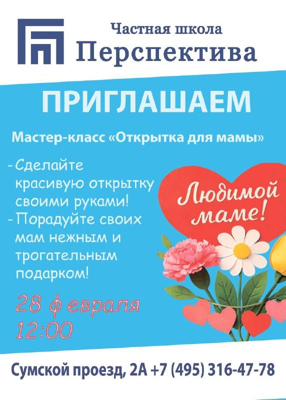 Ребят ожидает праздничный мастер-класс,по созданию открытки для мам. Начало в 12:00 Москва, Сумской проезд 2 а 8-495-316-22-88 8-495-316-00-74