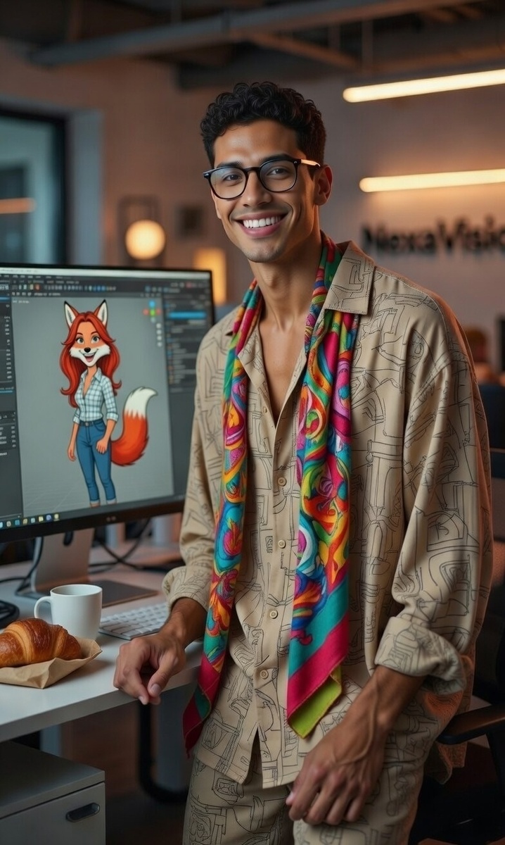 Творческий вихрь и возмутитель корпоративных чатов. 3D-дизайнер NexaVision. Душа компании, мастер визуальных эффектов и главный поставщик смеха. Если в офисе слышен хохот — значит, Ник опять что-то «отрендерил». Возраст: 29 лет Внешность: высокий, худощавый парень с тёмной кожей и короткими вьющимися волосами. Обладает ослепительной белозубой улыбкой, которая работает эффективнее любого осветительного прибора в студии. Быстрые, почти всегда улыбающиеся глаза. Лицо открытое, дружелюбное, часто с выражением легкой задумчивости. Одежда: Предпочитает свободные рубашки с необычными, порой психоделическими узорами. Его визитная карточка — яркий шарф, который он часто носит, создавая образ богемного художника. Довершают облик очки в толстой оправе (чисто для имиджа, зрение — как у орла). Особая фишка — яркие, иногда с безумными принтами носки, которые он демонстрирует, закатывая штанины. Темперамент и характер: сангвиник с некоторой примесью флегматика. Легок в общении и (почти) всегда позити