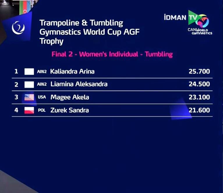 В Баку завершился первый этап Кубка мира по прыжкам на батуте. Блестяще в столице Азербайджана выступила Арина Каляндра. Действующая чемпионка мира стала победительницей женских соревнований на акробатической дорожке. Следом финишировала другая россиянка – Александра Лямина из Краснодара. Ставропольская дебютантка Елена Нейман вслед за подругами заняла третье место по итогам квалификации, однако не смогла пробиться в финал из-за лимита на двух представителей одной страны в решающей стадии турнира. В состязаниях мужчин в финал Кубка планеты вышел еще один воспитанник ставропольской спортивной школы Василия Скакуна – Валерий Кошкин, но подняться на пьедестал почета нашему земляку, который также дебютировал на состязаниях столь высокого уровня, в этот раз не удалось – он закончил выступления на четвертой позиции.