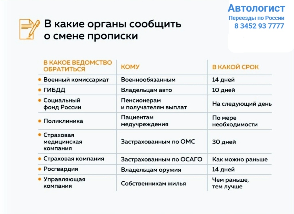🏥 Медицинское учреждение (Поликлиника) Обязательно прикрепитесь к поликлинике по новому месту жительства. Для этого посетите выбранное медицинское учреждение, обратившись в регистратуру. Не забудьте взять с собой паспорт, полис ОМС и СНИЛС. ❗ Военкомат Лица, состоящие на воинском учете, обязаны в течение двух недель после переезда (получения регистрации по новому адресу) явиться в территориальный военкомат для постановки на учет. Это требование действует, даже если ваша прописка фактически не меняется. Несоблюдение сроков уведомления военкомата о смене места жительства может повлечь за собой штраф до 3000 рублей. 🚗 ГИБДД Автомобилистам потребуется внести изменения в свидетельство о регистрации транспортного средства (СТС) и, при необходимости, получить новый паспорт транспортного средства (ПТС) после смены региона проживания. Государственный регистрационный номер автомобиля при этом остается прежним. ☝🏻 ОСАГО В соответствии с условиями договора обязательного страхования гражданской
