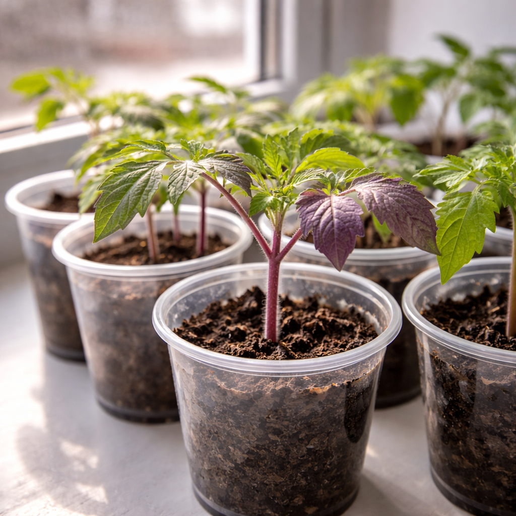 В марте с рассадой томатов иногда происходит странная вещь: стебель или нижняя сторона листьев становятся фиолетовыми. Первый раз, когда я это увидела, решила, что это болезнь или нехватка питания. Но со временем заметила — такое чаще случается именно в марте. И далеко не всегда это проблема. Иногда это просто реакция на условия. Даже если в комнате тепло, грунт в стаканчиках может оставаться прохладным. Особенно если рассада стоит: • на холодном подоконнике