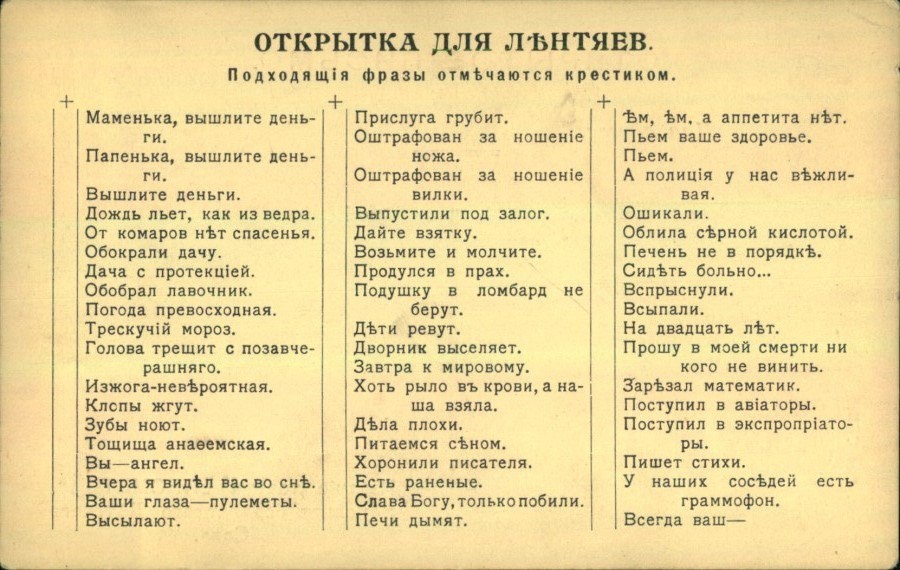 Были люди, которые не хотели нормально писать ещё в 1911 (а что-то ещё про клиповое мышление сегодня говорят). Для них придумали открытку, которая упрощала отправку сообщений. Как ей пользоваться: 1⃣ Отмечаем нужные фразы в каждой из трех колонок 2⃣ Указываем адрес получателя 3⃣ Вы великолепны. Ждём ответа. ➡️ Так люди упрощали себе дело: теперь отправить письмо было делом нескольких секунд. Выбираем свое сообщение. Мне нравится так: вышлите деньги — оштрафован за ношение ножа — а полиция у нас вежливая