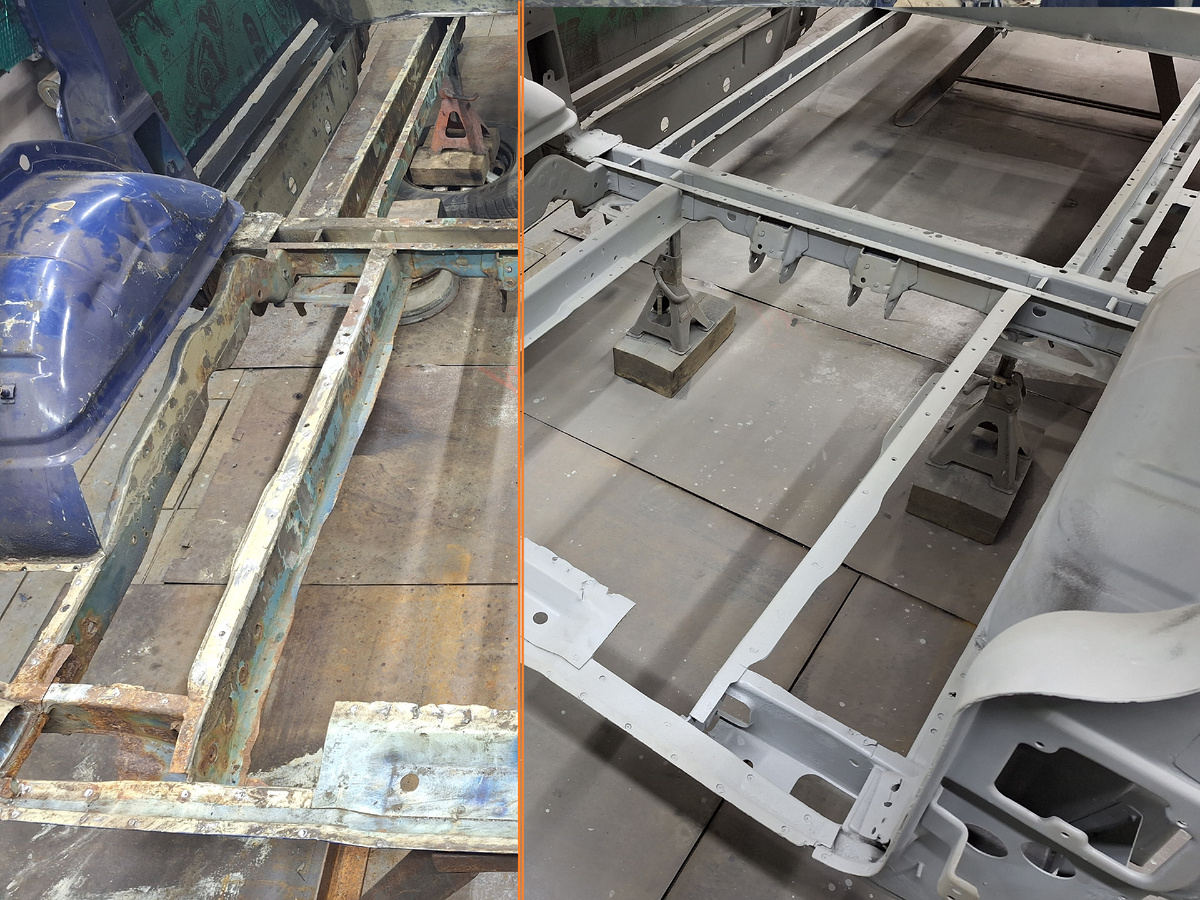 Вот состояние кузова до выполнения работ. Машина практически до болта разобрана, днище отчищено от заводского герметика (от него песок просто отлетает), гнилые элементы отпилены для доступа внутрь конструкции.