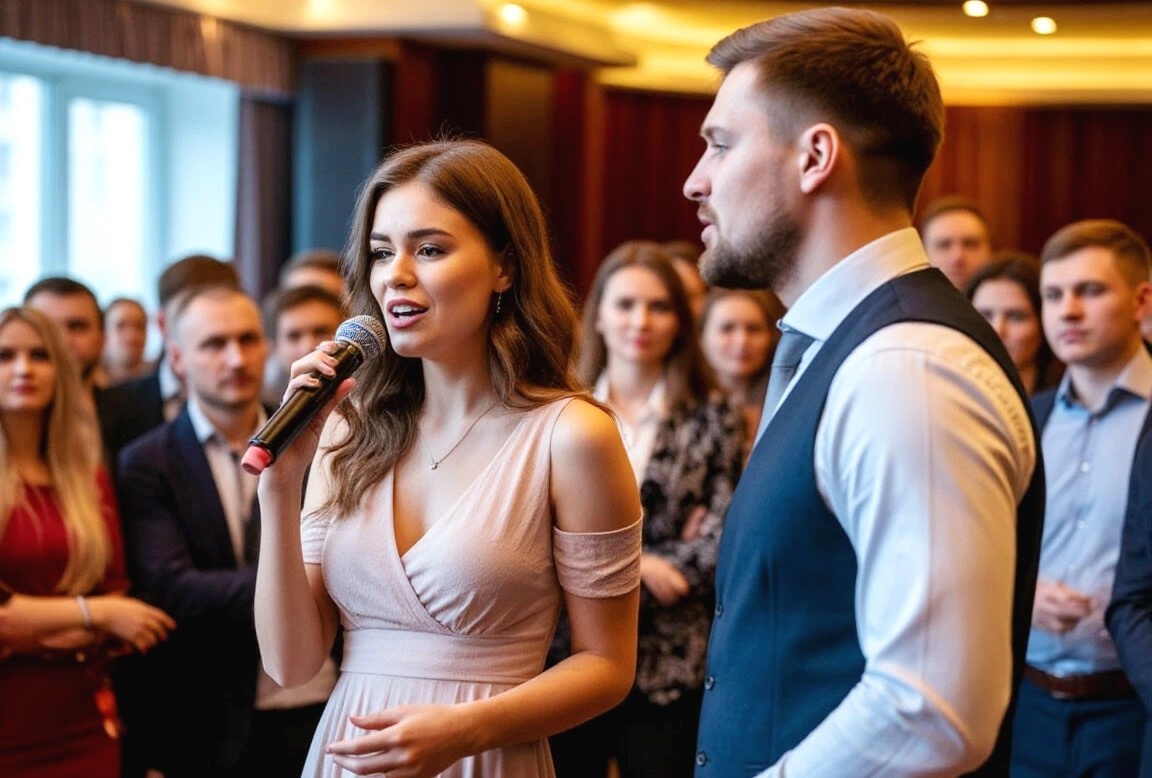 Голос был удивительный — глубокий, бархатный, проникающий прямо в душу. Марина почувствовала, как по спине побежали мурашки. Она посмотрела на сцену внимательнее. Лена из отдела кадров, тихая, скромная девушка, которая всегда ходила в простеньких платьях и редко с кем разговаривала. А сейчас она преобразилась — стояла уверенно, глаза сияли, и казалось, что поёт она только для кого-то одного.