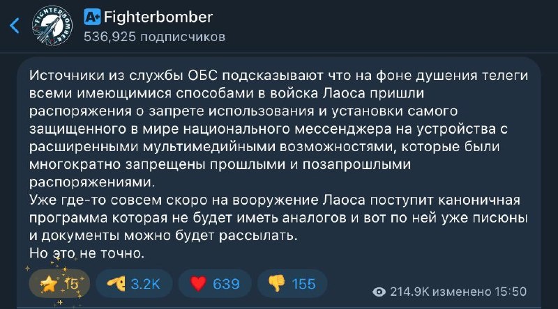 Российский блогер Fighterbomber, бывший военный шиурман, в своем тг-канале на пол ляма подписчиков опубликовал инетресную информацию, скрин поста привел В войсках рекомендовали не ставить самый защищенный национальный мессенджер из-за проблем с безопасностью, а продолжить пользоваться Телеграмом Неловко вышло Ведь какой бы супер-мега-гипер защищенный месеенджер ты не поставил, он будет работать: ◾️На американской ОС (Android, iOS), где можно всё просмотреть средствами ОС и отправить куда надо ◾️На китайоской ОС и отправить уже в китайское "куда надо" ◾️А ВСЁ! вы думали я тут про российские ОС напишу? их купить - еще постараться надо Магазины Всёсмарт закрылись, где продавали смартфоны на ОС Аврора Осталась только наша глыба и слоны РЕД ОС М со смартфоном AQphone M11, кстати, напишите кто у знакомых видел такой смартфон/кто купил (яж знаю, что это до 3000 человек на всю страну) Больше ничего купить нельзя, так что, вот если бы, допустим, у нас на СВО решили на смартфоны наших