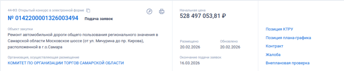 В 2026 году в Самаре отремонтируют ключевой участок Московского шоссе протяженностью 7,8 километра — от улицы Мичурина до проспекта Кирова. Министерство транспорта Самарской области объявило конкурс на выполнение работ стоимостью 528,49 миллиона рублей. Средства поступят из областного и федерального бюджетов, прием заявок от подрядчиков завершится 19 марта, а сами работы запланированы на период с 1 апреля по 1 сентября 2026 года. Подрядчику предстоит устранить колейность, обновить асфальтобетонное покрытие, привести в порядок обочины, а также установить новые дорожные знаки и барьерные ограждения. Фото: скриншот с сайта Госзакупок Трамвайно-троллейбусное управление города объявило о старте закупок материалов для масштабного обновления транспортной инфраструктуры.