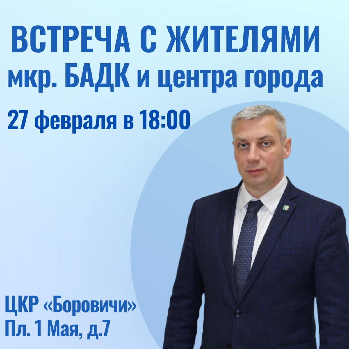 ! Продолжаю проводить встречи с жителями микрорайонов города Боровичи. 📍В пятницу, 27 февраля, в 18:00 состоится встреча с жителями мкр. БАДК и центральной части города в Центре Культурного Развития «Боровичи» (Площадь 1 Мая, д.7) Приглашаю всех желающих принять участие во встрече и обсудить насущные вопросы для дальнейшей выработки путей их решения. #ЕР53 #ЕР53Боровичскийокруг #Встречиснаселением