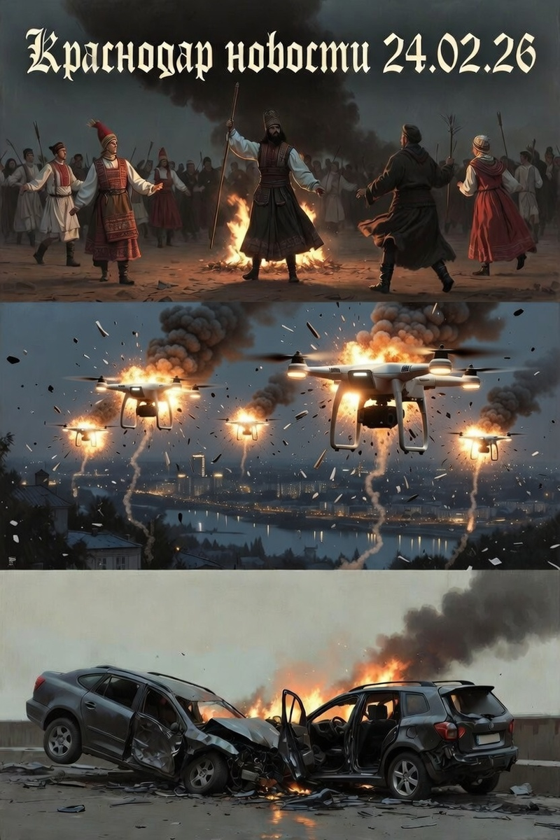 Краснодар, 24 февраля 2026 года – В этот день жители края столкнулись с комбинацией природных, социальных и военных событий. От традиционных праздников до отражения атак БПЛА, от транспортных проблем до дорожных инцидентов – день выдался насыщенным. Сегодня в Краснодаре наблюдалась переменчивая погода: температура воздуха +6°C с частичной облачностью. К вечеру ожидается потепление до +10°C завтра с дождями, что привело к локальным подтоплениям улиц. Почасовой прогноз показывает осадки в основном после полудня, ветер до 4 м/с, осадки до 0.2 мм. 24 февраля отмечается Васильев день и День рождения лотереи. Именины у Всеволода, Гавриила, Георгия, Дмитрия, Егора, Захара. Традиции включают обряды от нечистой силы, освящение ржаного каравая в церкви и кормление им животных. Закалывают кабана или телку для жаркого. Музыкальный район Краснодара вновь привлек внимание блогеров. Видео показывают подтопленные улицы с грязью, переполненные мусорные свалки, разрушенные строения. Тема остается попул