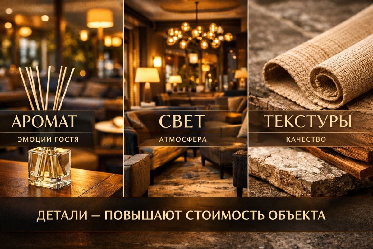 Когда гость заходит в отель или туристический комплекс, он оценивает пространство неосознанно — через ощущения. Не только глазами, но и кожей, слухом, обонянием. Именно детали формируют то самое чувство «здесь приятно» или «чего-то не хватает». Аромат. Нейтральный, чистый, едва уловимый — он создаёт ощущение порядка и статуса. Индивидуальный аромат может стать частью идентичности объекта. Гость может не запомнить цвет стен, но точно запомнит атмосферу. Свет. Слишком холодный — удешевляет. Слишком тусклый — утомляет. Многоуровневое освещение (общий, акцентный, декоративный свет) создаёт глубину и уют. Свет способен подчеркнуть текстуру материалов и архитектуру пространства. Текстуры. Натуральные ткани, дерево, камень, тактильно приятные поверхности — это ощущение качества. Даже простое пространство может выглядеть дорого, если грамотно подобраны материалы и их сочетания. Уровень объекта — это не всегда про бюджет. Это про продуманность. Когда аромат, свет и материалы работают вместе, пр