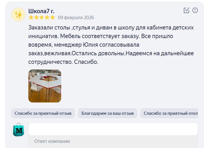 Для МБОУ СОШ №7 (г. Клинцы, Брянская обл.) мы оборудовали кабинет детских инициатив: установили столы «Точка Роста», модульный диван, штабелируемые стулья и шкаф-витрину. Получилось современное пространство для идей, встреч и проектов ❤️ Особенно ценно, когда школы находят время поделиться обратной связью. Спасибо за доверие и тёплые слова — для нашей команды это лучшая мотивация работать ещё лучше! 🤝