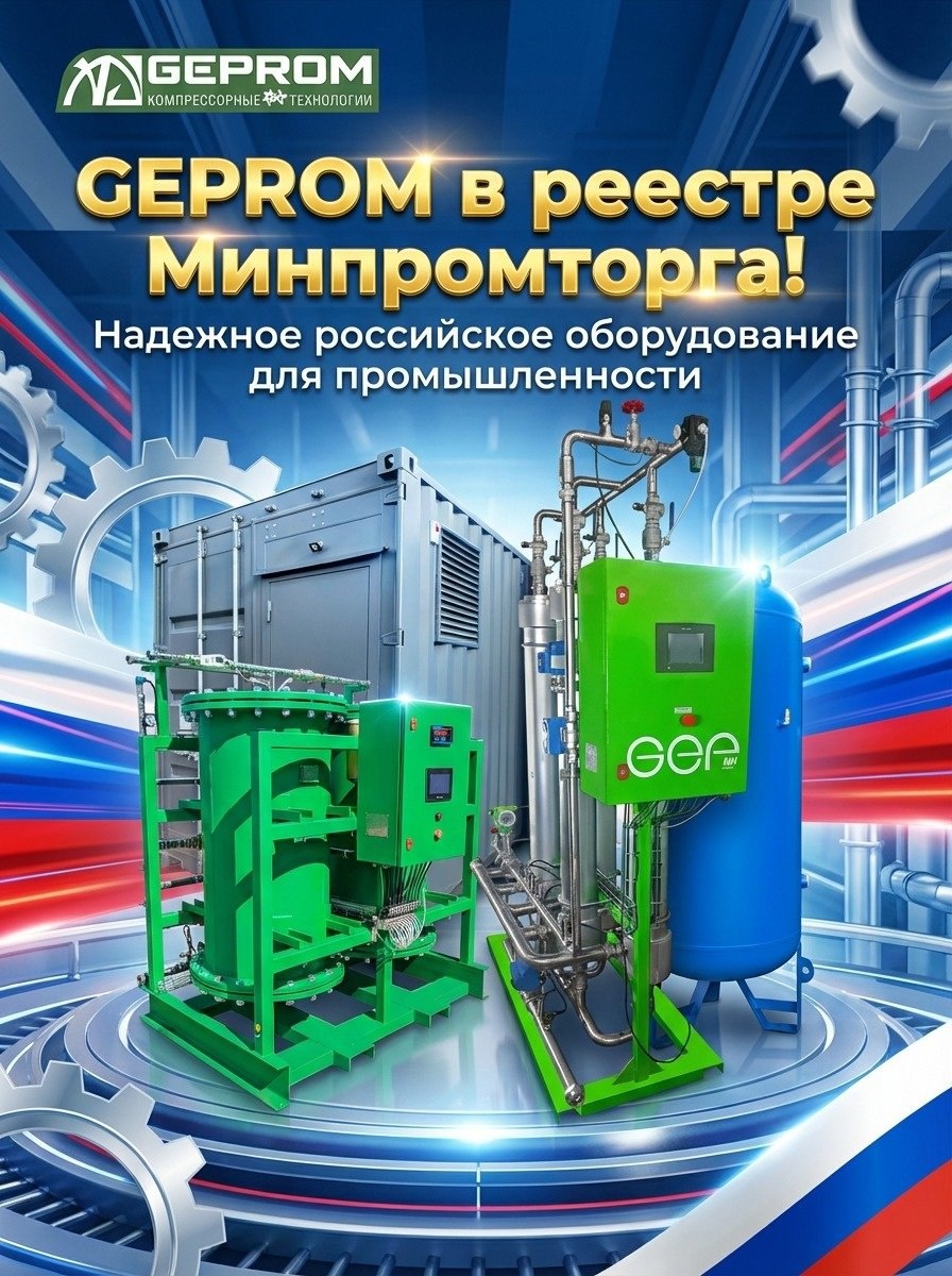 Наша продукция официально внесена в Реестр российских производителей Министерства промышленности и торговли РФ. Это означает, что при закупках вы получаете: ✅ Приоритет по 44-ФЗ и 223-ФЗ ✅ Подтверждённое российское происхождение ✅ Надёжного отечественного партнёра Что производим: 🔹 Воздушные ресиверы — 240–900 л, 10–40 бар 🔹 Генераторы азота — адсорбционные и мембранные 🔹 Компрессорные станции — стационарные и мобильные 🔹 Адсорбционные осушители сжатого воздуха Мы не просто производитель — мы предлагаем адаптированное решение для вашего производства. Импортозамещение без компромиссов по качеству 💪 🏭 "GEPROM" Компрессорные технологии 🌍 Site: geprom.ru 🌐 Tg: t.me/geprom_ru
