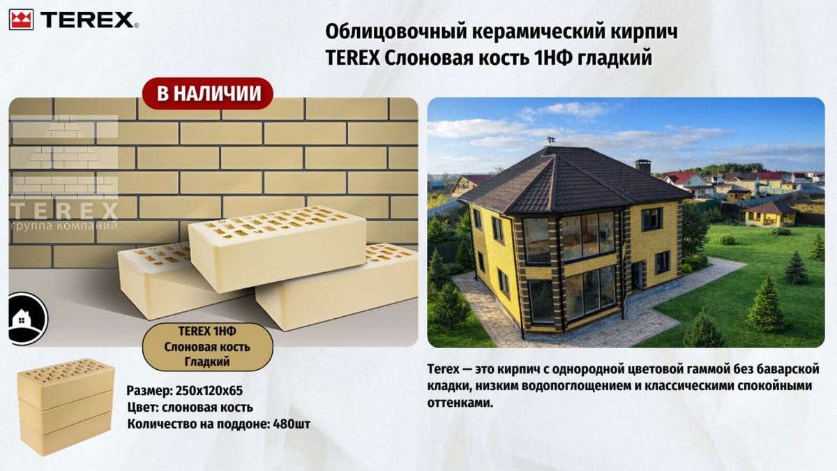 Если вы ищете облицовочный кирпич без лишней пестроты и баварской кладки — обратите внимание на Terex. Здесь представлены 4 цвета TEREX 1НФ гладкий: ▪️ Слоновая кость ▪️ Какао ▪️ Дюна ▪️ Солома Это лишь часть ассортимента — вариантов значительно больше. Полную линейку можно посмотреть на нашем сайте. ✔️ Однородная цветовая гамма — фасад выглядит аккуратно и статусно ✔️ Низкое водопоглощение — меньше риска высолов и разрушений ✔️ Классические спокойные оттенки — подходят под любой проект ✔️ Очень привлекательная цена От светлых тёплых фасадов до более глубоких и контрастных решений — можно подобрать вариант под любую архитектуру. Такой кирпич выбирают, когда важны: — чистая архитектура — долговечность — понятный, предсказуемый результат Если нужен расчёт по количеству или хотите узнать актуальную цену — напишите в личные сообщения, подберём решение под ваш проект. Или позвоните по телефону 8 800 444-01-36
