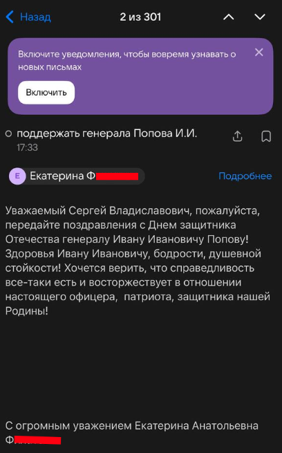 "Вот такие письма присылают мне с пожеланиями в адрес Попова И.И., с поздравлением в День защитника Отечества!!! Иван Иванович настоящий герой и защитник, и останется таким навсегда, поскольку он один из не многих, который доказал это на деле, а не на словах! Человек ,патриотизм которого превалирует над всем, который всегда с гордостью произносит что он сын своей Родины- России!!! И за нее готов отдать свою жизнь, о чем и говорят его многочисленные государственные награды, которыми он был награжден указами всех трех Президентов России!!! Т е все Президенты России оценили его значительный вклад в защите интересов нашей страны!!! С Днём защитника Отечества поздравляю всех причастных и желаю скорейшей нам Победы над врагом!!!! Мы едины - мы непобедимы!" (адвокат Ивана Попова Сергей Буйновский). Комментарий. Обычных россиян никакие "суды" не обманут. Кстати, тем, кто его "заказал" они таких писем не пишут. И их со временем они забудут (и для них это, пожалуй, лучший исход). А подвигов Ива