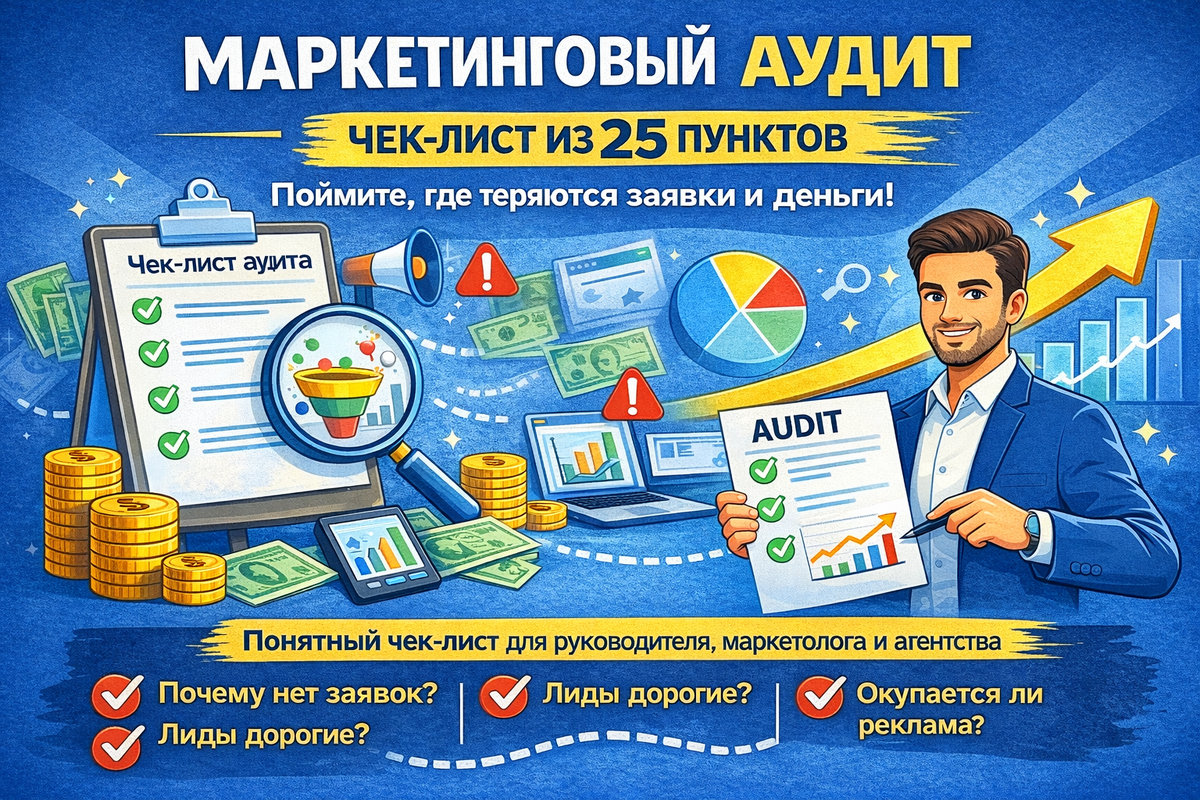 Маркетинговый аудит нужен, когда маркетинг есть, а управляемости нет. Этот чек-лист помогает быстро выявить 5–7 точек, которые дают максимальный эффект: рост конверсии, снижение стоимости лида и повышение продаж.