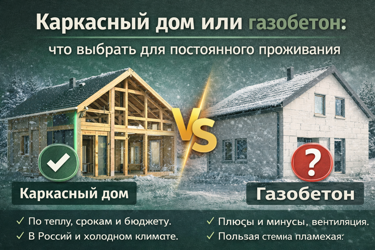 Сравнение каркасного дома и газобетона по теплу, срокам и бюджету. Разбираем, что лучше каркасный дом или газобетон для постоянного проживания в России, и на что смотреть, чтобы дом был теплым и предсказуемым в эксплуатации.