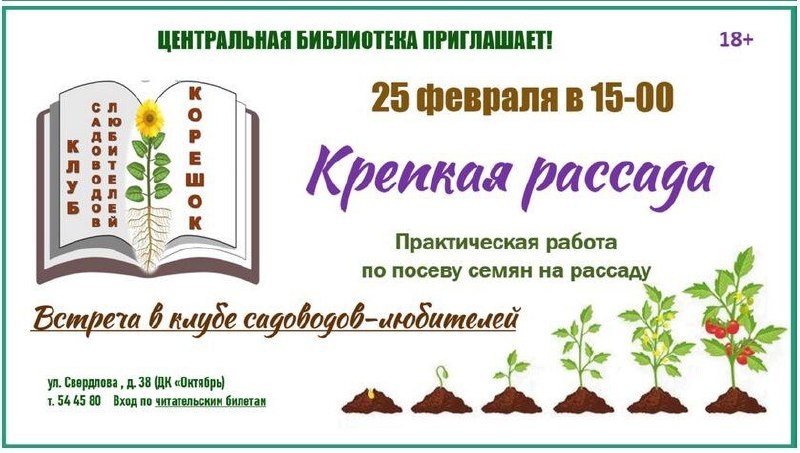 ✨ Встреча в клубе садоводов-любителей "Корешок" Обсудим: "Крепкая рассада: практическая работа по посеву семян на рассаду "🔻 ❗Вход по читательским билетам 🚫 Возраст: 14+ 📆 25.02.2026 🕒 15:00 🏢 Центральная библиотека 📍 г. Подольск, ул. Свердлова, д. 38 ⭐Поддержать канал голосом 🍰Где поесть в Подольске ✅ Мероприятия Подольск https://dzen.ru/id/66ed500f7b5671493eca3fd6 http://vk.com/podolsk_events http://dzen.ru/podolsk_events