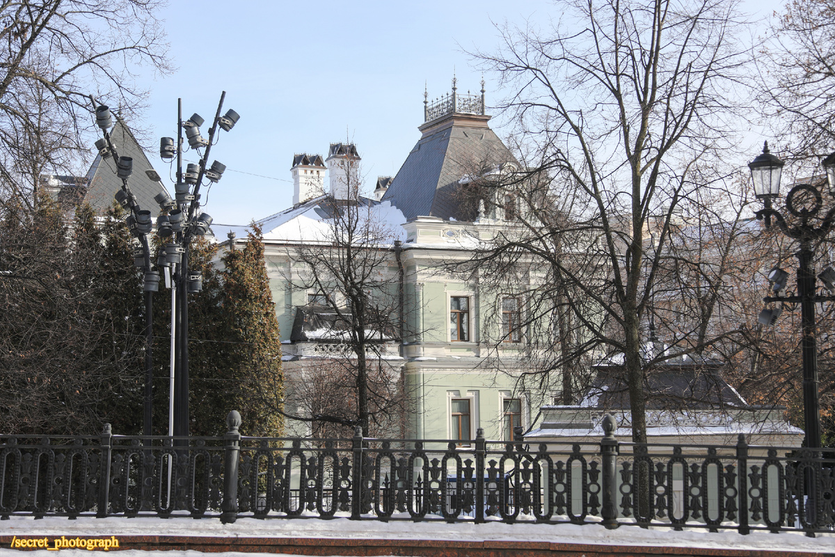 Каждый очередной раз попадая на Яузский бульвар, всегда жалею, что этот эклектический дворец с шатровой крышей очень трудно рассмотреть целиком и со всех сторон. В нескольких местах препятствует непроницаемая живая ограда из высоких туевых деревьев, а летом он и вовсе утопает в зелени настолько, что его почти не увидать. Зато сейчас, зимой, как раз то время, когда многие шедевры архитектуры открываются нам во всей красоте. Или почти во всей. Изгородь из туи ведь никуда не делась.