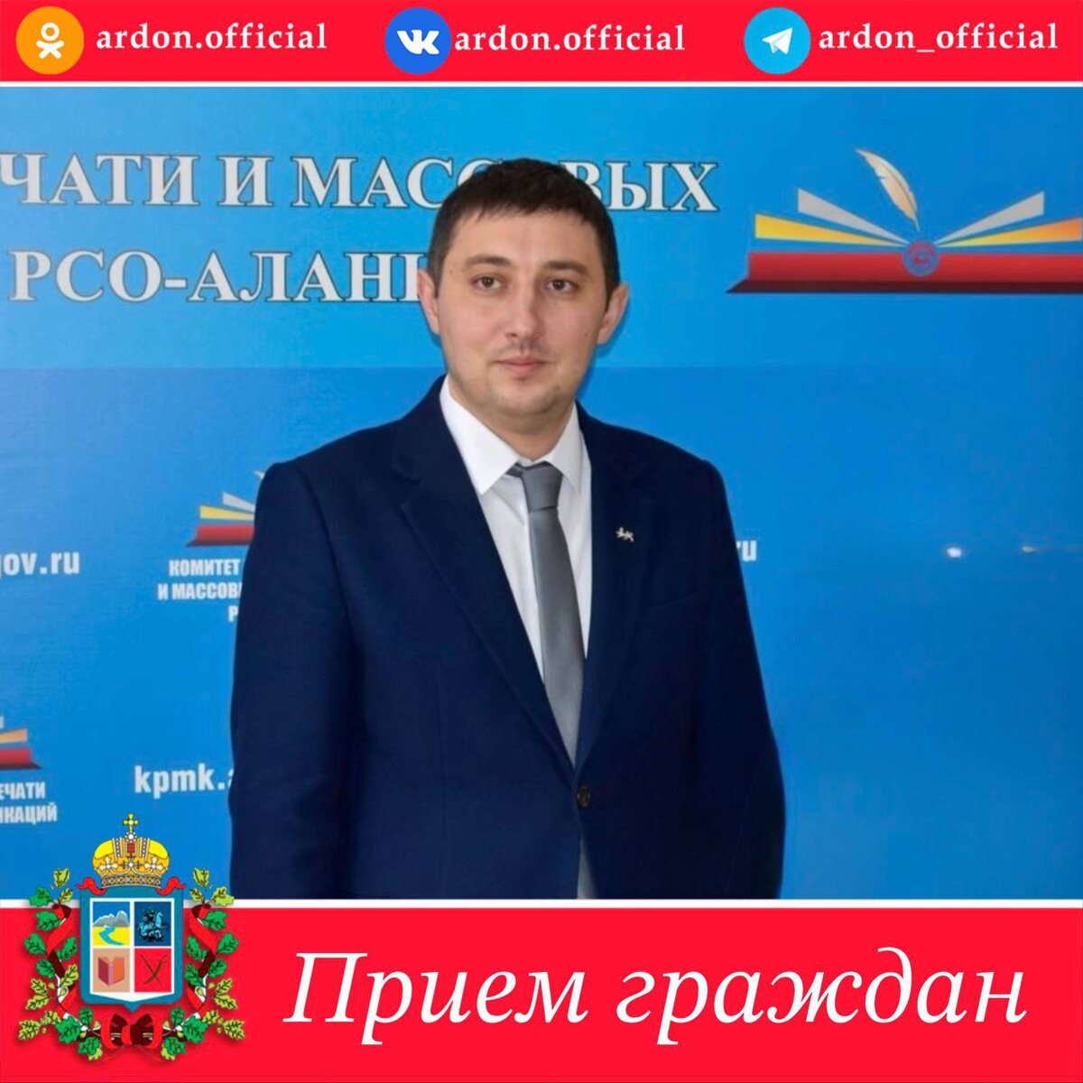 ! Врио председателя Комитета по делам печати и массовых коммуникаций РСО-Алания Афашоков Эльдар Эльбрусович проведет личный прием граждан в АМС Ардонского района. Дата приема: 25 февраля Время: 10:00 Адрес: ул.Советов, 6. Запись по телефону: 8 (86732) 3-01-78 внутренний 237 ✍️✍️✍️✍️✍️✍️✍️✍️✍️✍️
