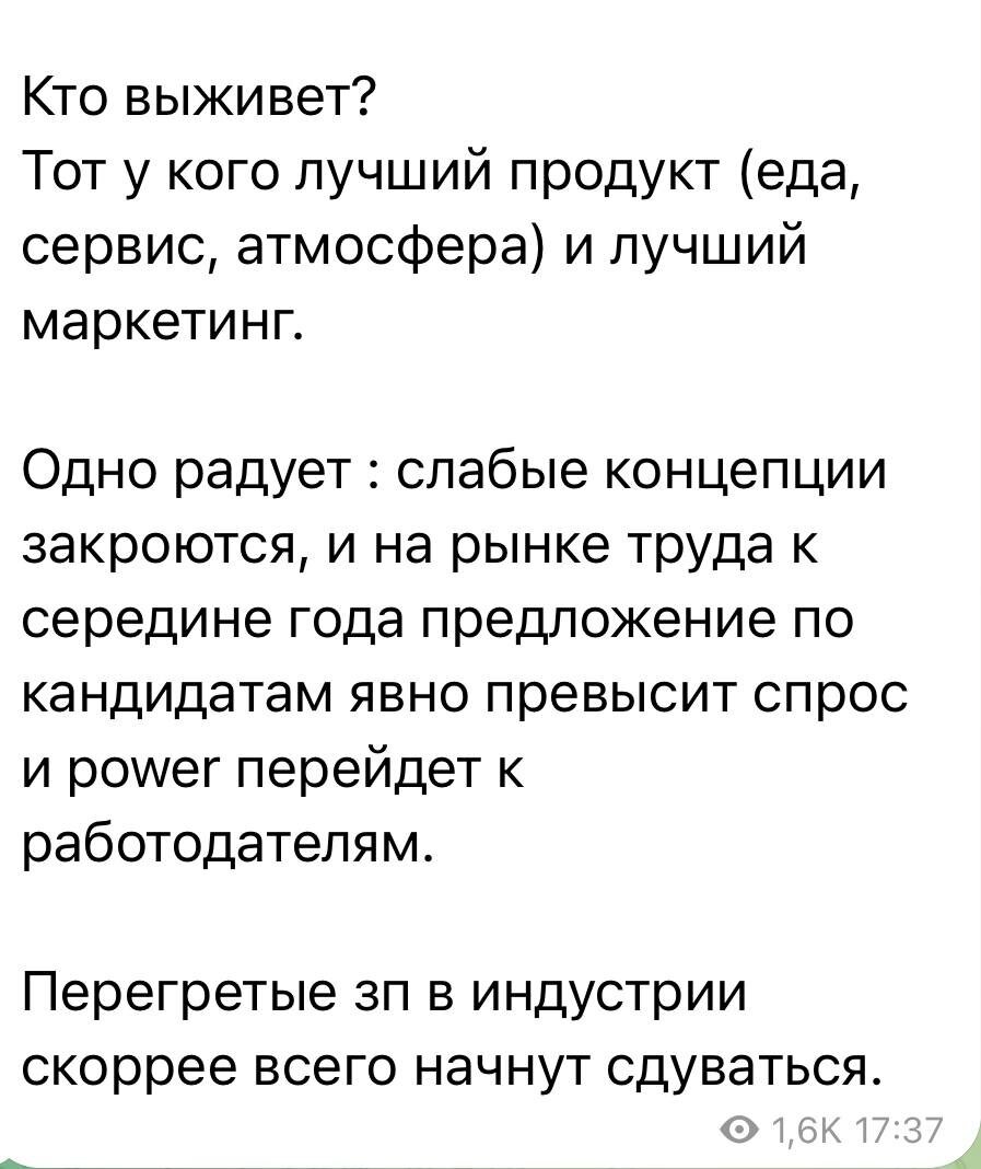 Есть, что сказать 🤗 1) слабые концепции закроются -да 2) кандидаты освободятся. А вам нужны кандидаты из «ресторанов-трупов»)? Вряд ли 3) перегретые зп в индустрии- не перегреты. Смотря на зп выкладываемые некоторыми пабликами - зарплатам ой как далеко до перегретости! Ну просто ради интереса зайдите в такие паблики, ну покажите мне хоть одно перегретое предложение! Аж злюсь! Общие выводы: ✔️ уволенные или ушедшие из неприбыльных проектов сотрудники мало кому нужны ✔️они наконец-то сменят работу с хореки на иную сферу. А кто-то может и на пенсию уйдет😂 ✔️зарплаты не перегреты, так как жизнь особенно в столице - дорогая