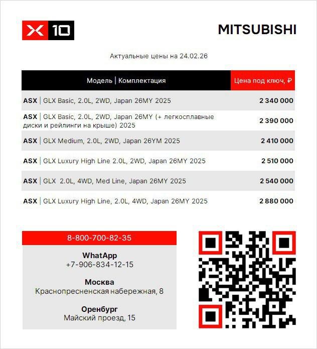 ) 🟢Подробности комплектации Medium Line 2WD 🟢Подробности комплектации Medium Line 4WD 🟢Обзор комплектации High Line 4WD 🟢Обзор комплектации High Line 2WD 🤑 Цены указаны с учётом растаможки и доставки в Москву Остались вопросы? Менеджеры на связи: 📞 +7(800)700-82-35 бесплатно по РФ 📞 +7(919)868-97-47 Иван 📞 +7(922)856-66-66 Сергей (авто из Кыргызстана) 💬 MAX 💬 Telegram 💙 Сообщество в VK 🖥 Сайт 📍Оренбург, проезд Майский, 15 📍Москва, Краснопресненская набережная, 8 #x10прайс #mitsubishiasx
