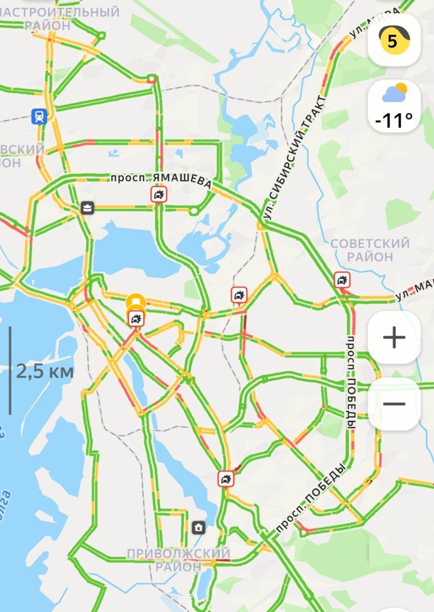 По данным «Яндекс.Карты», движение автомобилей затруднено в Советском, Приволжском, Вахитовском, Кировском и Ново-Савиновском районах. Причиной большинства заторов стали ДТП.
