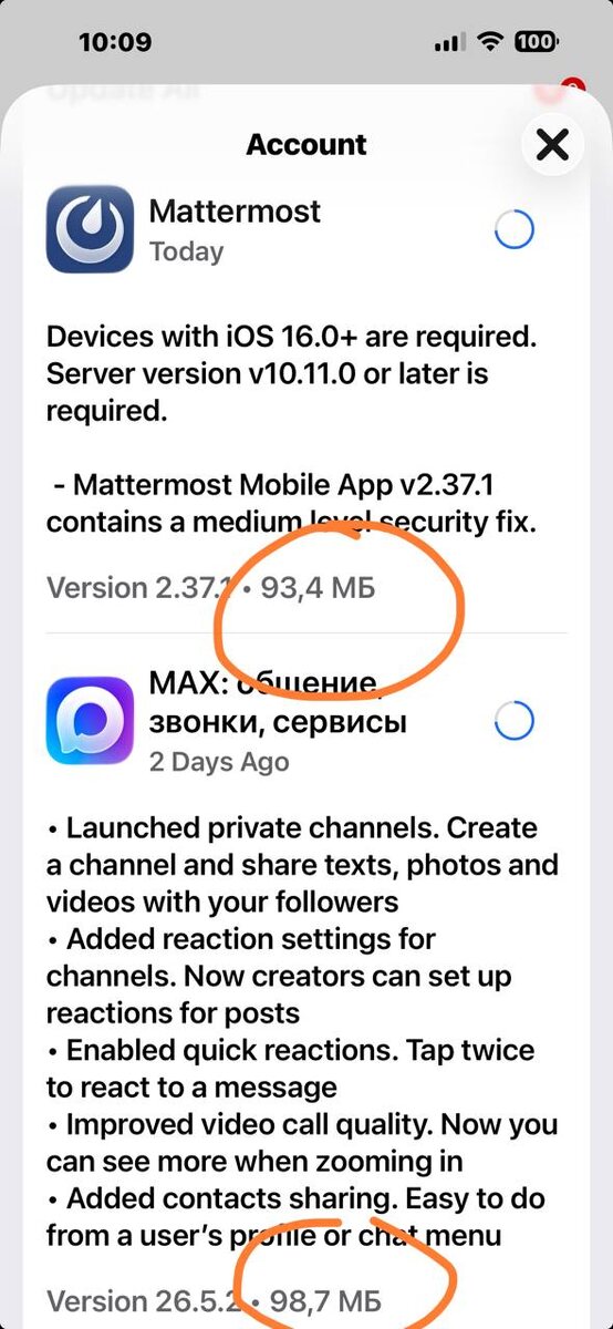 Обновились на моем айфоне, размер пакетов подсветил. Первый - внутрикорпоративное общение (очень рекомендую), второй - ну ... в представлении не нуждается. Кстати, первый то сделан на Electron и размер не удивляет, а вот на чем сделан MAX, что он такой большой? Русский ИТ бизнес