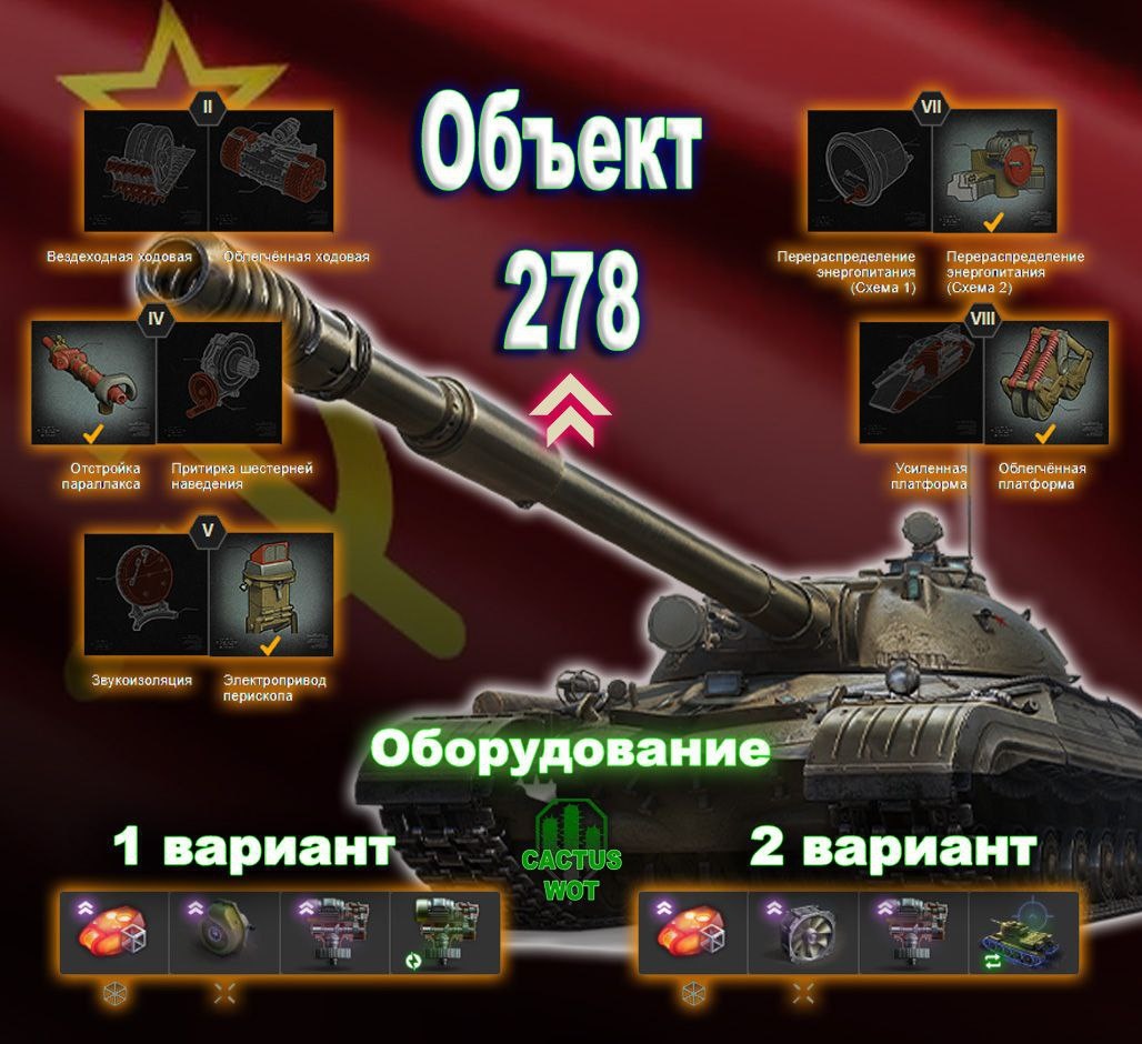 🏦 Тяжёлый танк прорыва 10 уровень. СССР. 🔼Полевая модернизация на картинке🔼 ТТХ: Калибр (мм)130 Урон (ед.)470 / 470 / 590 Бронепробиваемость (мм)265 / 324 / 65 Скорострельность орудия (выстр/мин)4.62 Заряжание орудия (с)11.70 Время дозарядки одного снаряда (с)13 / 16 / 20 Время перезарядки между выстрелами (с)3 Снарядов в магазине (шт.)3 Скорость гориз. перевода прицела (град/с)30 Углы поворота башни (град)180 / 180 Углы вертикальной наводки (град)-5 / 16 Время сведения (с)2.70 Разброс на 100 м (м)0.40 Средний урон в минуту (ед/мин)2169.23 Боекомплект (шт.)35 Живучесть 564 Прочность (ед.)2100 Бронирование корпуса (лоб/борт/корма в мм)130 / 90 / 50 Бронирование башни (лоб/борт/корма в мм)300 / 200 / 90 Время ремонта ходовой (с)12.03 Мобильность 608 Масса (кг) 50500 Мощность двигателя (л. с.)1000 Удельная мощность (л. с./т)14.56 Макс. скорость / задний ход (км/ч)55 / 15 Скорость поворота шасси (град/с)28 Незаметность 103 Неподвижной машины (%)0.12 В движении (%)0.06 Наблюдение 598 О