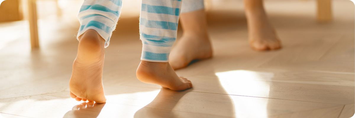 Отдельно стоит рассказать, как развиваются ноги и стопы у детей. Малыши часто рождаются с плоскими стопами: там, где у взрослого выражен свод, у грудничка располагается жировая подушечка, которая защищает ещё мягкие кости и связки. Поэтому стопа выглядит «плоской» и это может сохраняться примерно до трёх лет, а у некоторых детей — чуть дольше, особенно если они быстро набирают вес или мало двигаются. Свод формируется постепенно по мере укрепления мышц, связок и освоения ходьбы и бега.