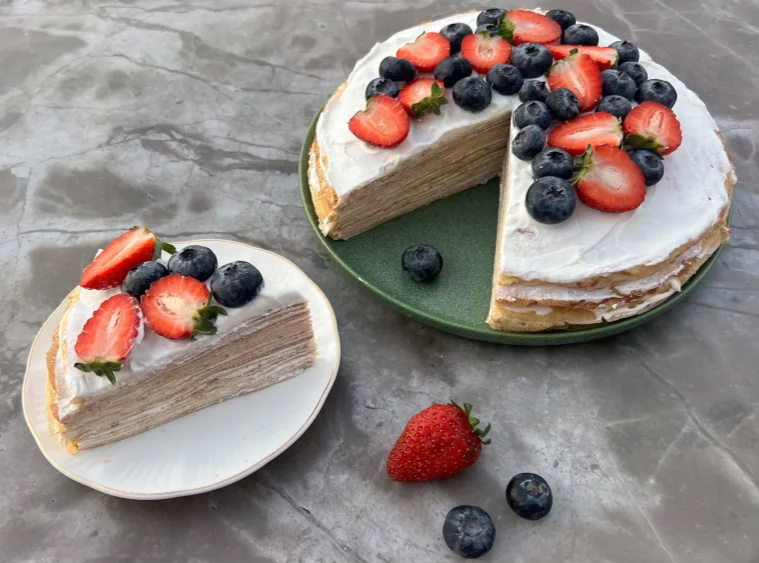 Этим красивым и вкусным десертом Вероника Трифонова советует отпраздновать проводы Масленицы. Беспроигрышный вариант для такого праздника и не только! Ингредиенты для блинов: 400 мл молока, 400 мл кипятка, 300 г пшеничной муки, 50 г топленого сливочного масла, 4 яйца, 2 ст. л. сахара, 1 ч. л. соли, растительное масло для жарки, 250 г свежих ягод для украшения. Для крема: 400 г творога, 400 г сметаны (20-25%), 80 г сахара, 1 лимон, 1 ч. л. ванильного сахара. Топленое масло разогреваем до жидкого состояния в микроволновке или на плите. Яйца разбиваем в большую миску и перемешиваем миксером до однородности и пузырьков. Продолжая взбивать, тонкой струйкой вливаем кипяток, а затем частями всыпаем муку. В конце вливаем молоко и топленое масло и хорошенько вымешиваем. С лимона мелкой теркой снимаем цедру. Творог, сметану и сахар обоих видов пробиваем блендером до однородности. Добавляем цедру лимона, доводим массу до кремообразного состояния. Блинную сковороду разогреваем на среднем огне, сма