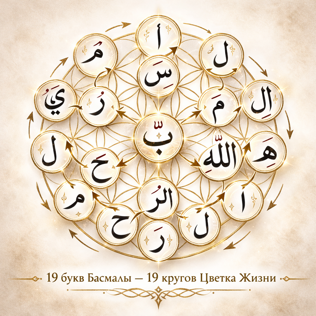Вся Ба — в точке. Это не поэтическая фраза. Это метафизическая схема. Познав некоторые истины, с уверенностью могу сказать, что это действительно так. ведь всем известный цветок жизни, это и есть Бисмиллях. Для подсказки тайн, смотрите рисунок ниже: Потому что Бисмиллях — это: начало откровения, начало чтения, начало действия, начало творен
