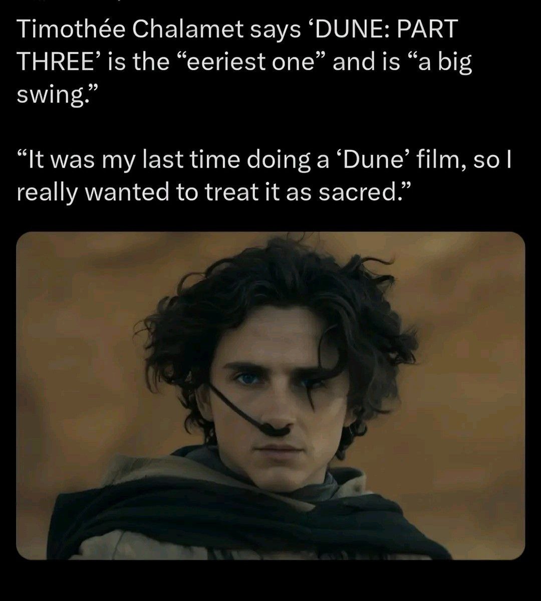 Тимоти Шаламе рассказал, что лента Дюна 3 (Dune 3) - "вышла самой жуткой и грандиозной