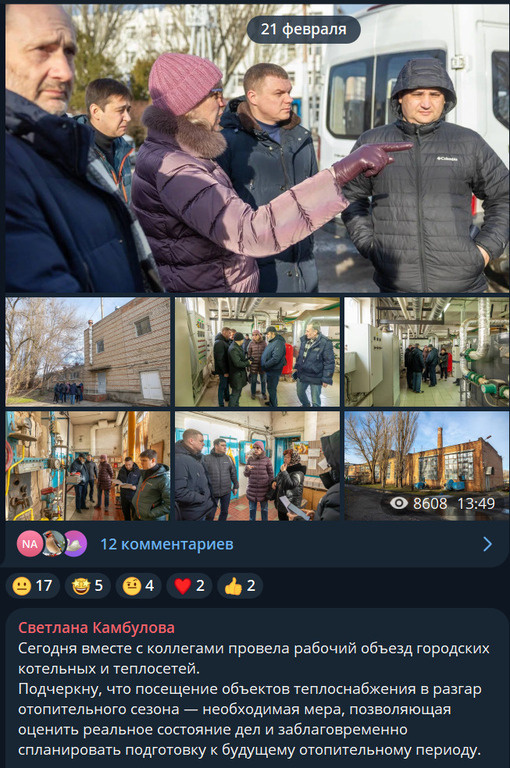 Вопреки, а не благодаря. Telegram-канал Светланы Камбуловой — это, пожалуй, лучший городской ресурс о реальном положении дел в Таганроге. Только не благодаря самой Камбуловой, а благодаря жителям, которые успевают оставить комментарии раньше, чем их затирает цензура. Читайте быстро — там правда живёт недолго. А правда простая: эту зиму Таганрог пережил не благодаря администрации, а вопреки ей. Жители в комментариях канала Камбуловой фиксировали: в квартирах холодно, температура опускалась до 15 градусов (а у кого-то было и ниже). При этом квитанции приходили по полному тарифу — 3 068,88 рубля за гигакалорию. Для понимания масштаба: именно по этой ставке считается всё тепло в вашем доме, независимо от того, дошло оно до батарей или нет. Люди докупали обогреватели, кутались в халаты и пижамы — и параллельно оплачивали отопление, которого толком не получали. Перерасчёта, судя по всему, не будет. А если кто и выбьет — получит копейки. 21 февраля Камбулова гордо отчиталась: объехала гор