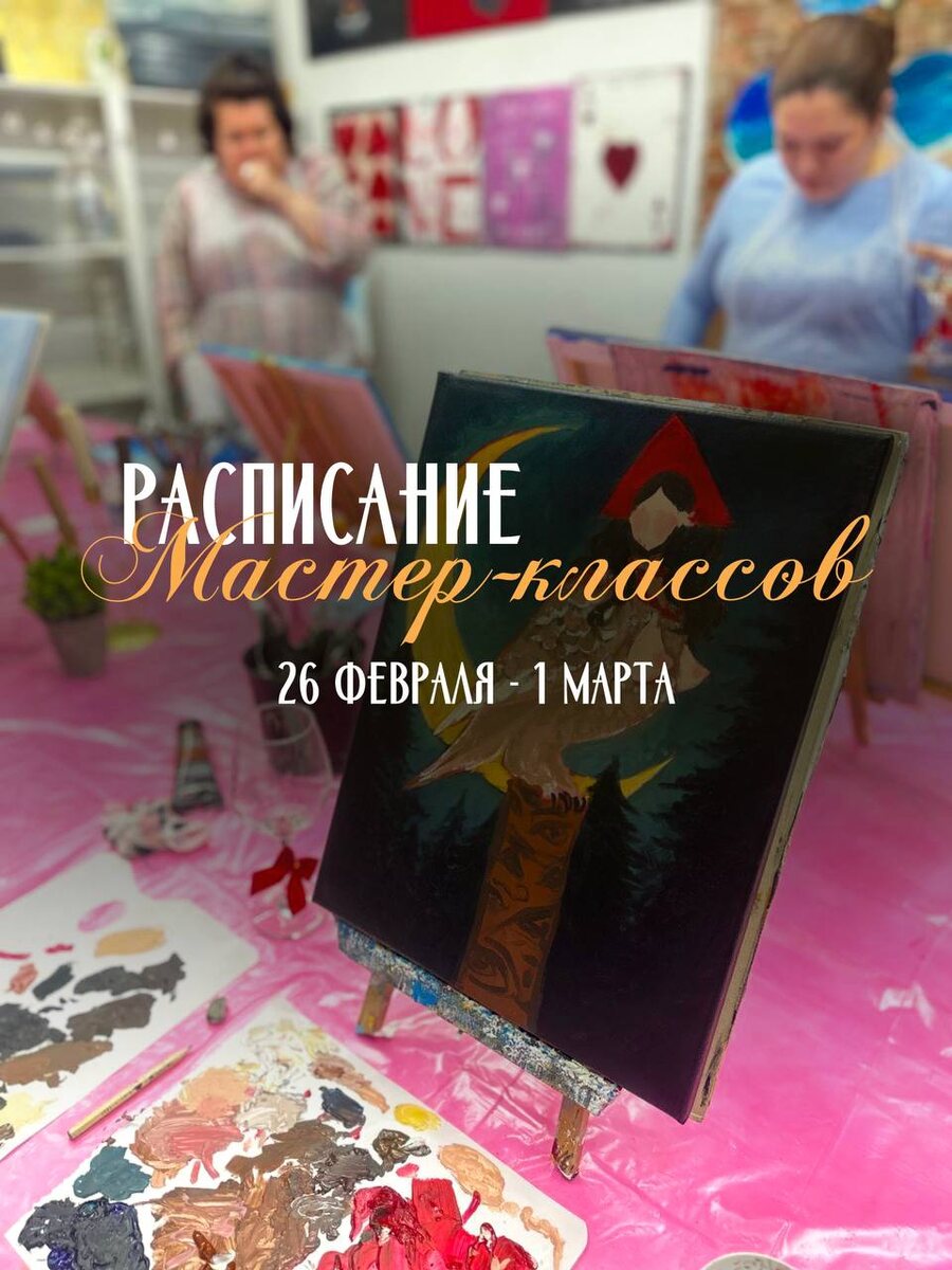! 26 февраля - 1 марта ____________________________________ И какие уроки у нас остались на эти даты😌 ✨26 февраля 19:00 Resin art - эпоксидная смола. Создадим с вами неповторимые работы из смолы, которые могут стать как прекрасной подставкой для чего-то или невероятной красоты декором. А также создать часы 🕰️ ____________________________________ ✨27 февраля 19:00 Интерьерная живопись сусальным золотом/текстурной пастой. Невероятное занятие, где создаются не реальные картины, блистающие на ☀️ ____________________________________ ✨ 1 марта 13:00 - Винная арт-вечеринка (живопись маслом/акрилом). Классика во всей ее красе. Что может быть лучше своей первой, яркой картины, которую вы написали за бокальчиком Prosecco? 17:30 - Светящаяся Луна 🌒 Те самые нашумевшие картины с подсветкой из текстурной пасты в ворсе луны. Это не просто картина, но и шикарный светильник для вашего 🏠. В общем одним словом - шикарно Выбирай свое занятие и день! И пиши нам для записи