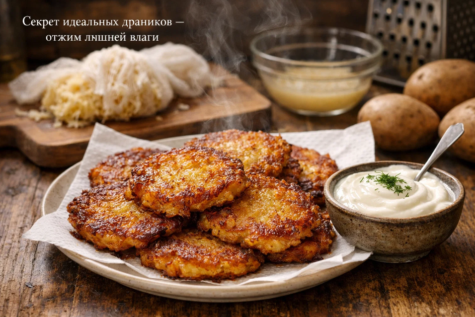 Картофель содержит большое количество воды и крахмала. Когда вы натираете клубни на тёрке, клеточные стенки разрушаются, и весь этот сок начинает активно выделяться. Если не избавиться от лишней жидкости, тесто для драников получится слишком жидким, и никакое количество муки не спасёт ситуацию. Мука, конечно, впитает часть влаги, но при этом драники потеряют свою характерную текстуру – хрустящую корочку снаружи и нежную картофельную серединку внутри. Вместо этого вы получите резиновые, плотные лепёшки, которые всё равно будут плохо держать форму.