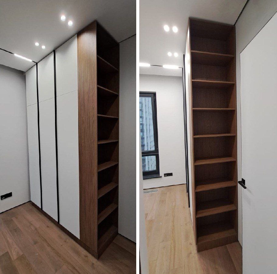 позже. Хозяин квартиры основную часть времени проводит на работе, что в идеале предусматривает максимальный функционал и простоту в использовании мебели. Эргономичная гардеробная с яркими брутальными нотками и обилием подсветки в дизайне имеет множество массивных просторных полок, штанг для одежды разной длины и различными ящиками, что позволит удобно расположить массу вещей в зоне прямого доступа. Поскольку гардеробная не является отдельной комнатой, для создания большей приватности она закрыта фасадами из металлопрофиля со стеклом графит. Для их крепления при ремонте нигде не были сделаны закладные или укрепленные перегородки, поэтому пришлось ставить их на мебельную "обвязку" и крепить непосредственно к самой гардеробной. В кабинете вместительный трехстворчатый шкаф со штангами, ящиками и полками, нишей под стремянку и открытым торцевым стеллажом в древесном декоре. #выполненныйпроект #мебельназаказ #жкпавелецкаясити