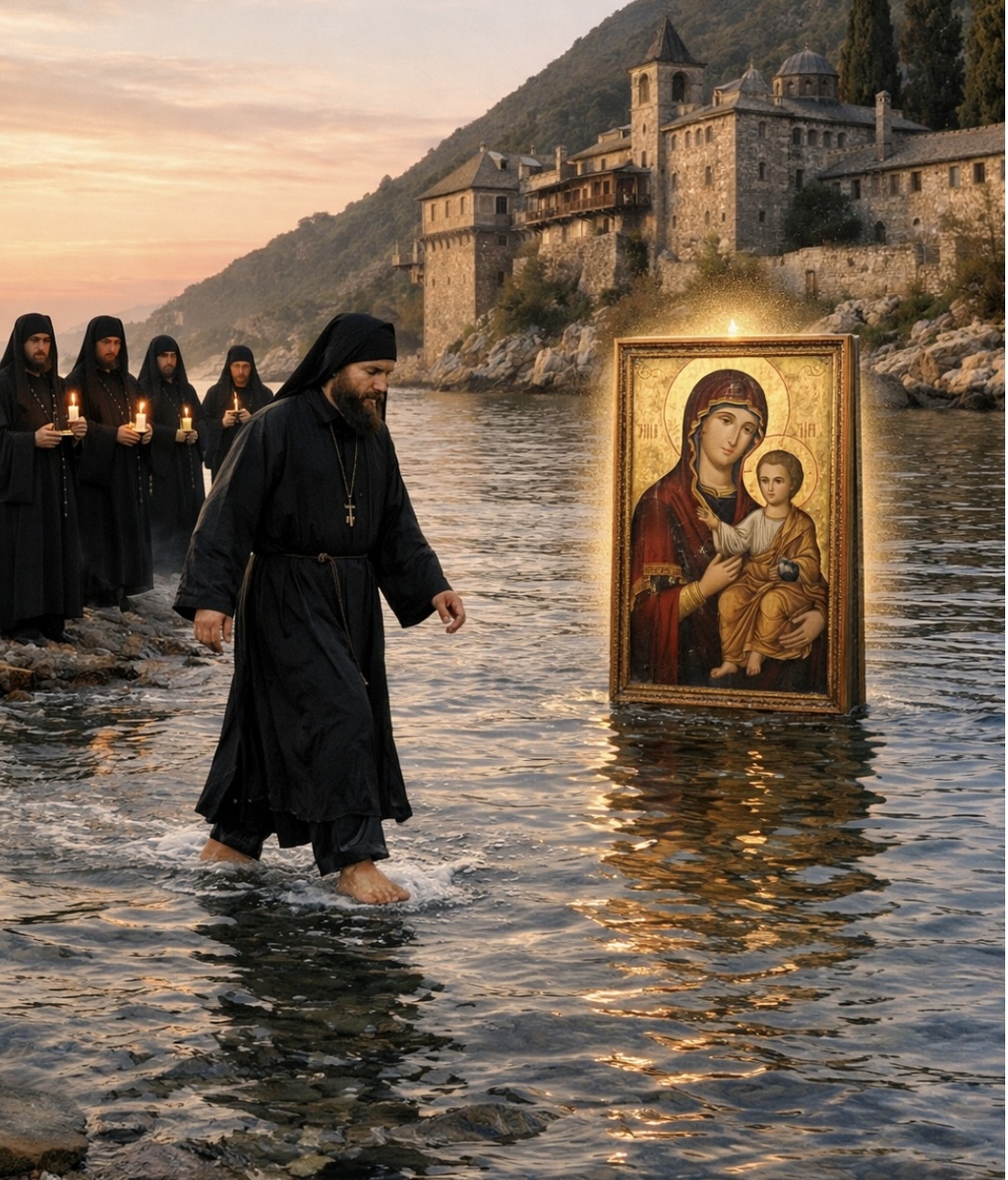 По откровению Пресвятой Богородицы одному из монахов — смиренному подвижнику, преподобному Гавриилу — было повелено идти по воде и принять икону.