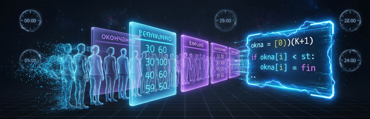 Создаём массив okna, где индекс — номер окна (от 1 до K), значение — момент окончания приёма в этом окне.