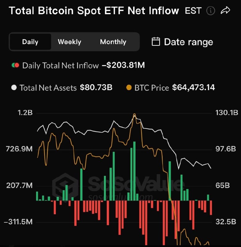 23 февраля биткойн-ETF зафиксировали чистый отток средств в размере 203,81 миллиона долларов